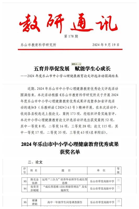 2024年度乐山市中小学心理健康教育优秀论文评选活动近期圆满结束,草堂高中五位教师:陈克金、彭媛媛、张泗、张荣芳、谢谦论文获奖!