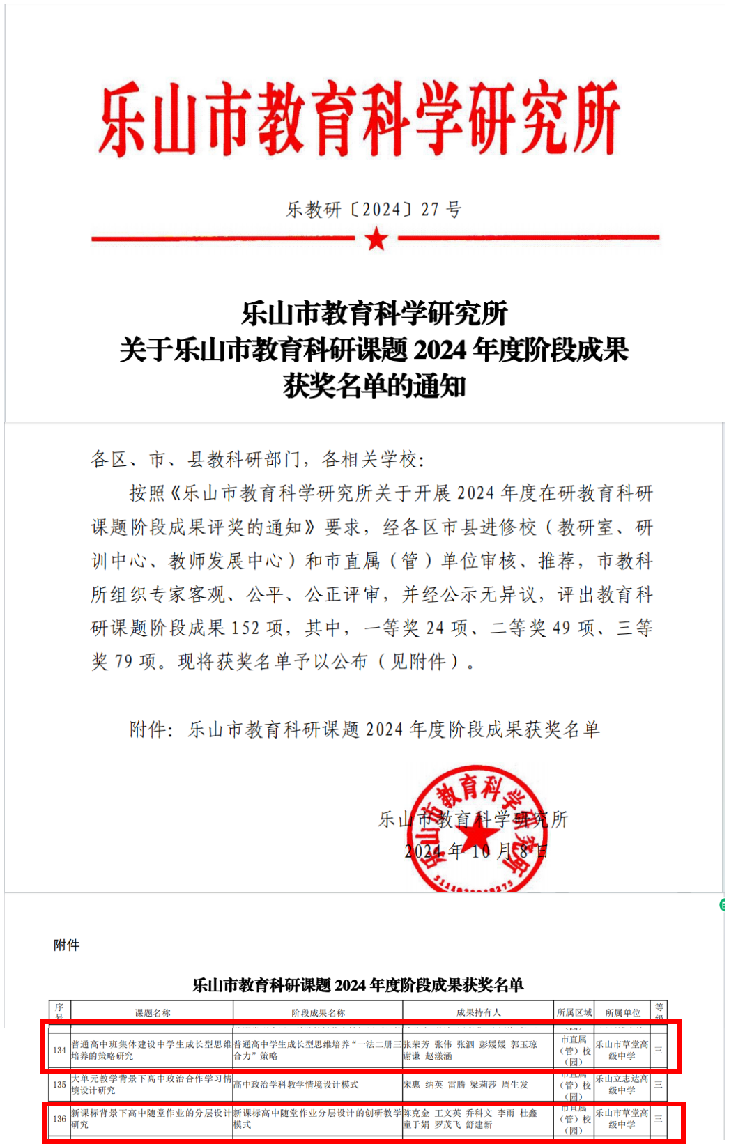 阶段成果获奖名单公布,草堂高中两个在研课题获奖!